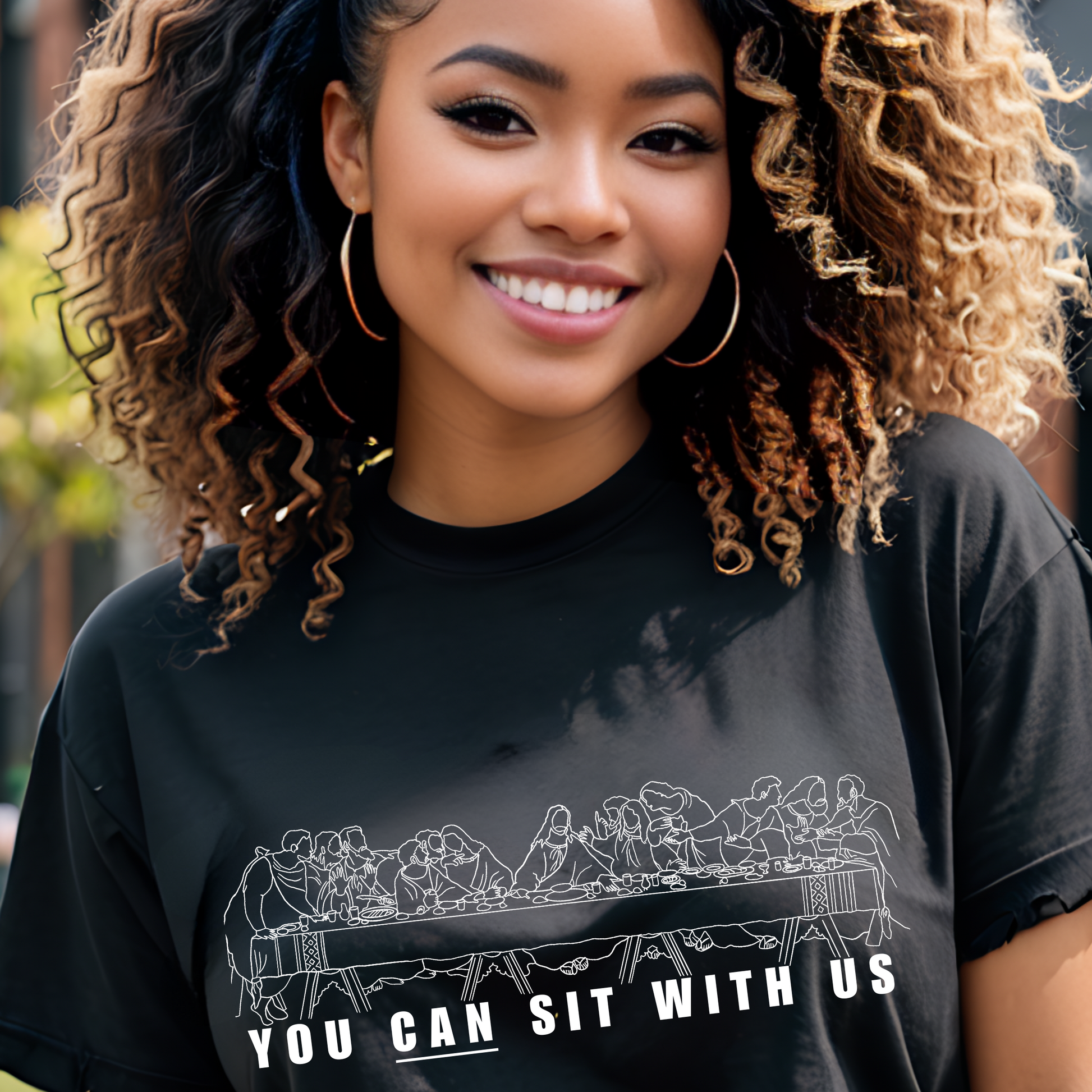 Our Christian-inspired apparel proudly declares, "You Can Sit With Us," inviting all to find belonging and acceptance. Wear it proudly and share the message of hospitality and unity wherever you go. Together, let's spread God's love and create a world where everyone feels welcomed and valued. Join the movement today. You're invited to sit with us. 1 John 4:21 whoever loves God must also love his brother.
